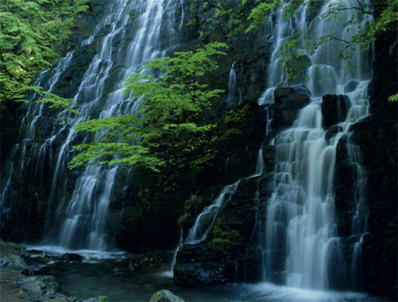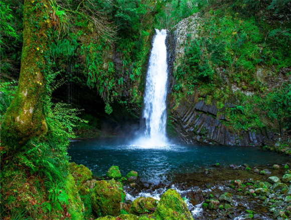 直落而下,瀑布声环绕着整个河谷,山中的水花和凉气替夏天带来一阵凉爽。